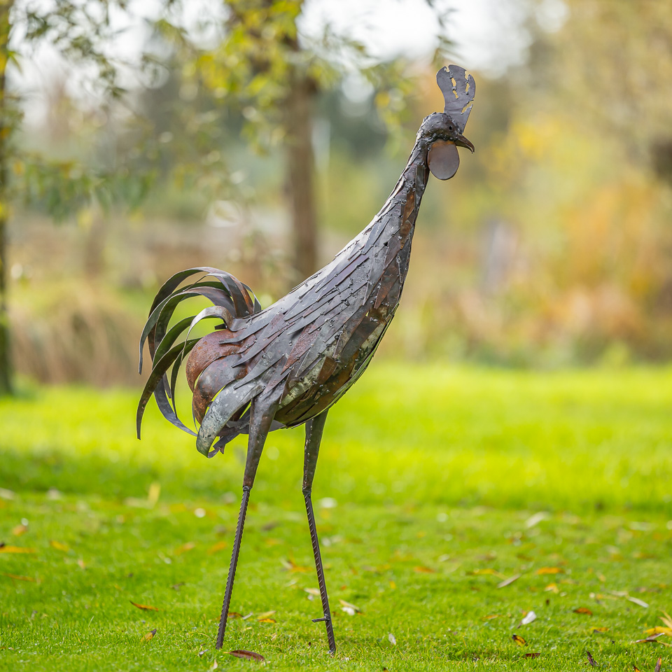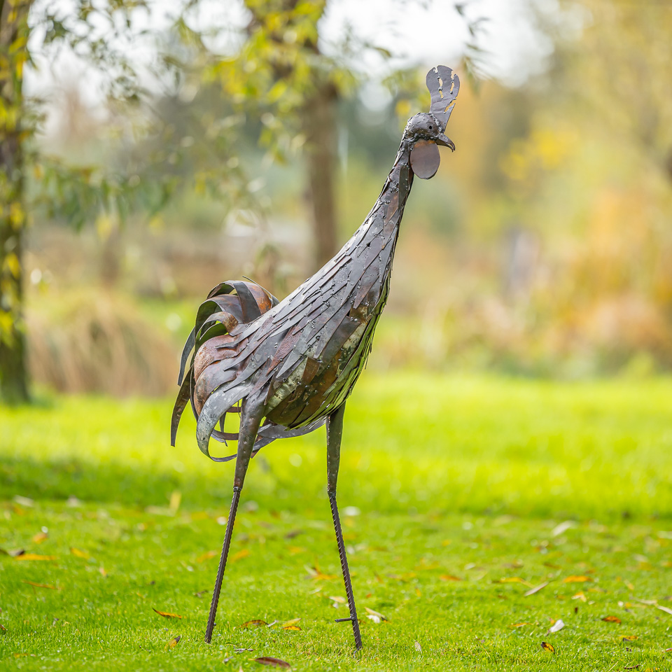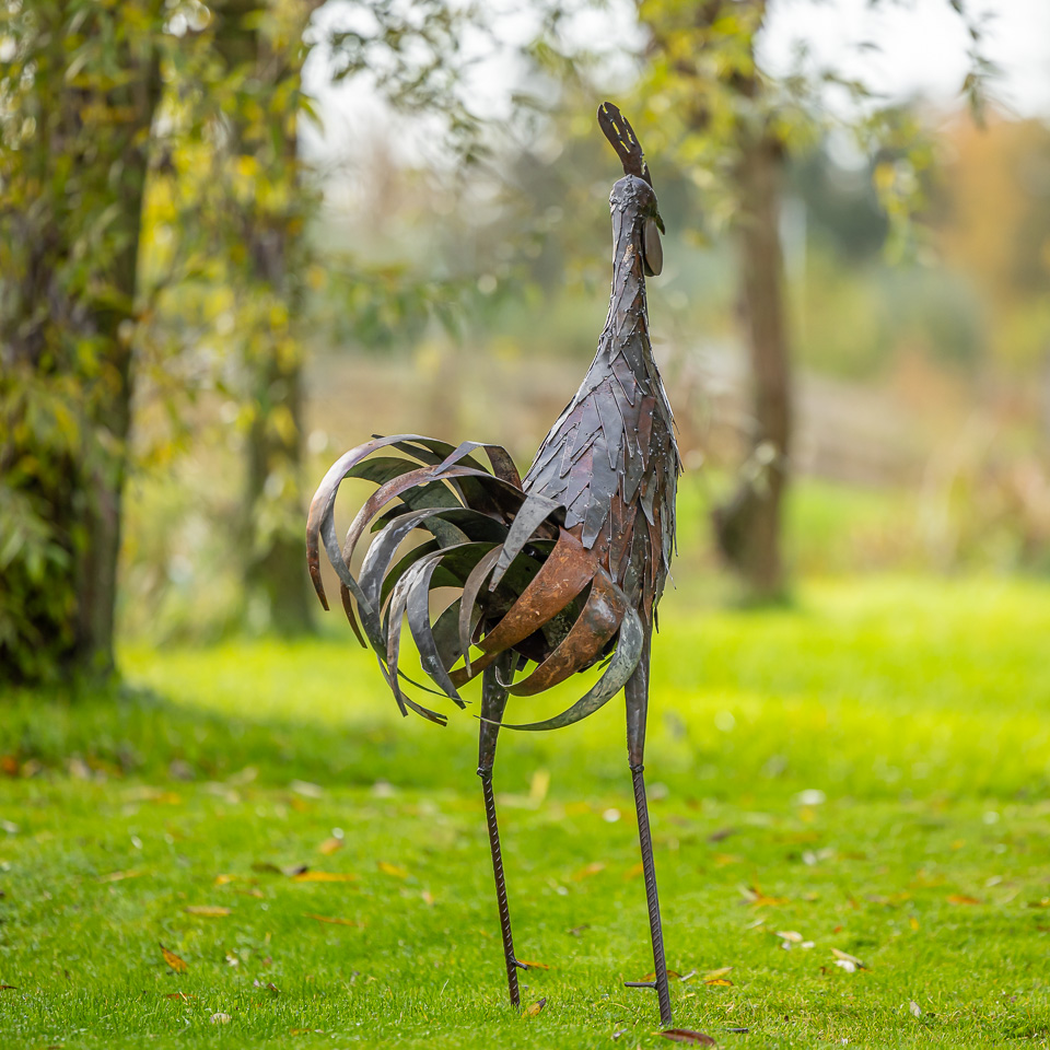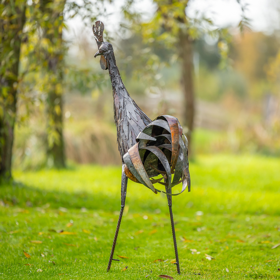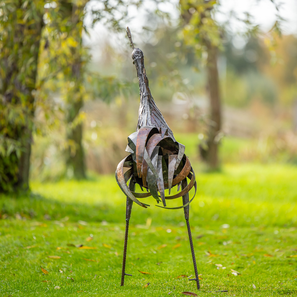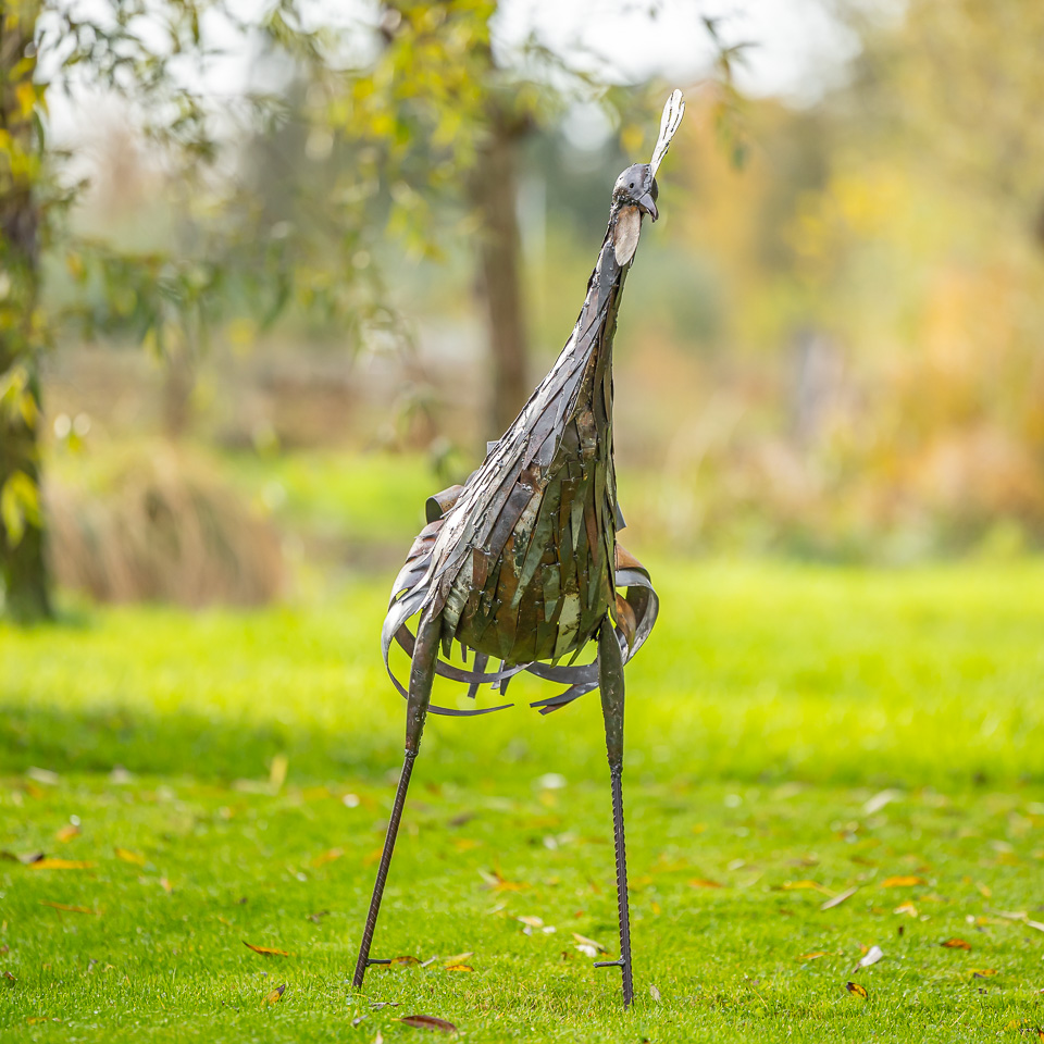 In Nederland lakken wij de beelden met een eersteklas transparante lak, zo kunnen ze zonder problemen in de tuin staan. Hoge metalen vogels lopen het risico om te waaien, daarom leveren we haringen mee om ze stevig vast te zetten.